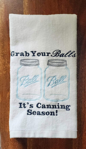 Grab Your Balls It’s Canning Season Funny Kitchen Towel – Farmhouse Canning Humor Hand Towel – Vintage Style Ball Jar Gift for Homesteaders